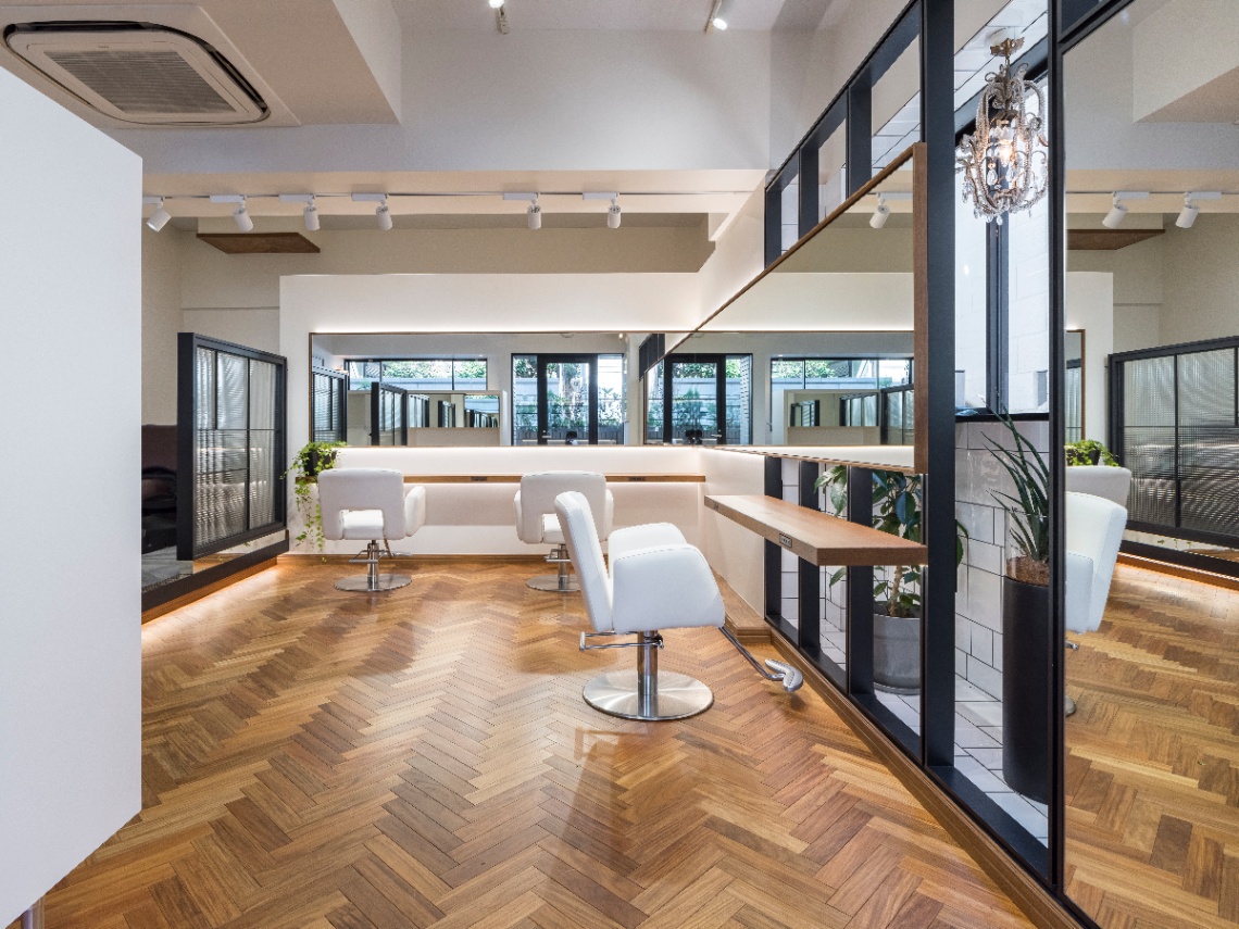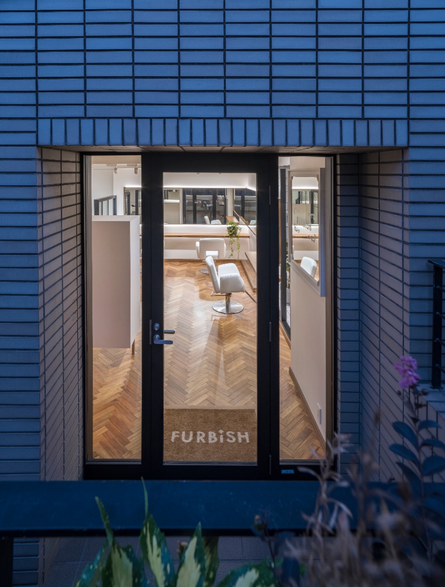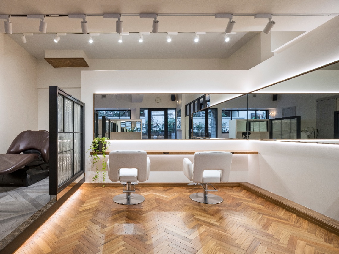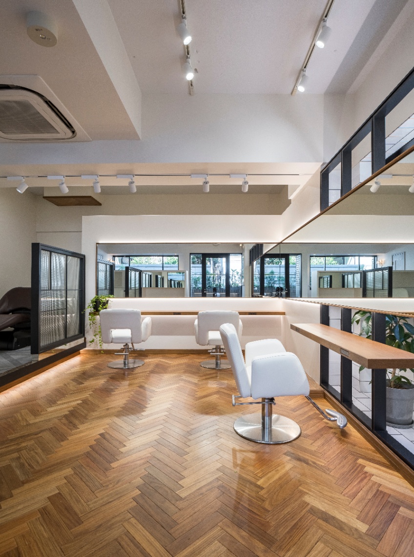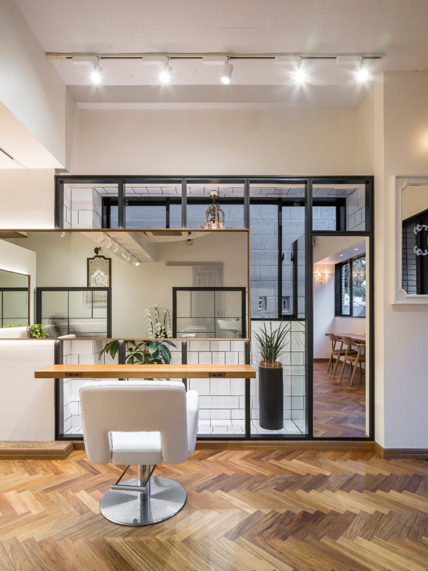 オーナーとの青山での4店舗目の美容室である。20年以上のお付き合いになる。物件探しから加わったこともあり、落ち着いた周辺環境で、設備の弱点のない建物と巡り会えた。鏡が角でつながっていて店舗に広がりを与えている。鏡とテーブルのセットで使いやすいと好評価を頂いた。窓際の凹みは小さな温室風に緑あふれる空間を意図した。初めのFurbish-Oneと比べると、オーナーと設計者共々、落ち着きのある空間を志向しているように思える。
