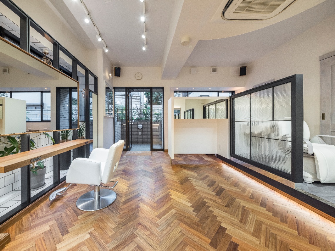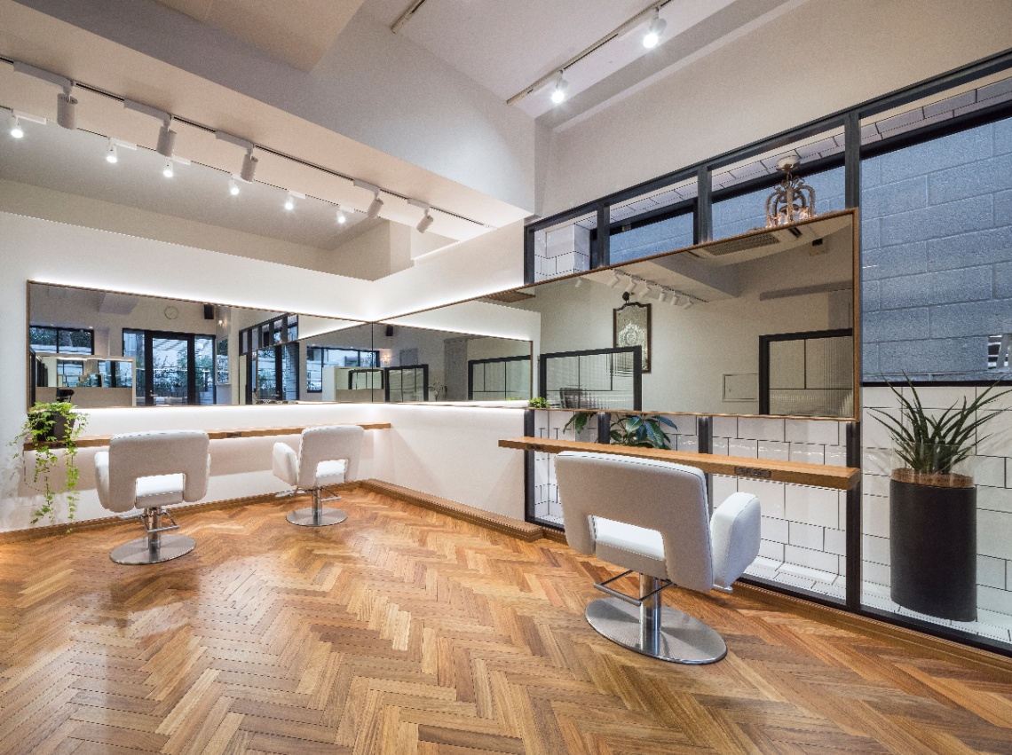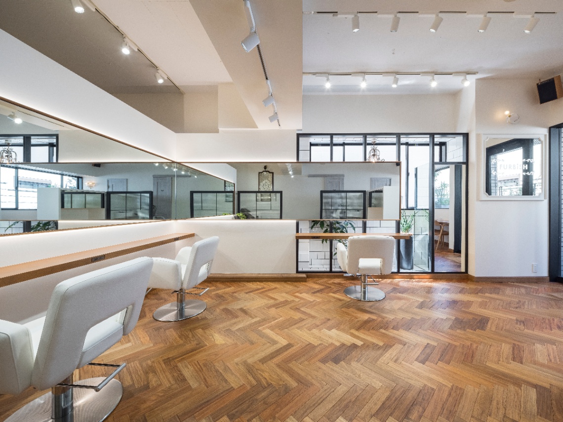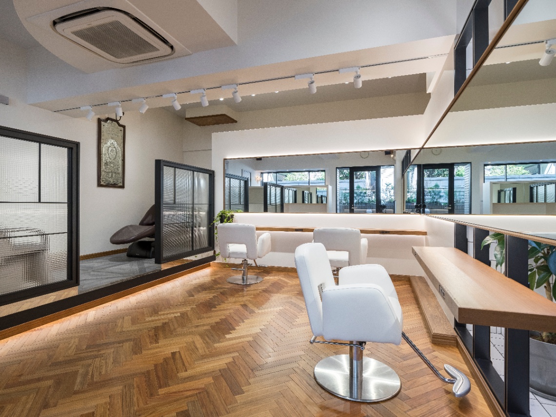 オーナーとの青山での4店舗目の美容室である。20年以上のお付き合いになる。物件探しから加わったこともあり、落ち着いた周辺環境で、設備の弱点のない建物と巡り会えた。鏡が角でつながっていて店舗に広がりを与えている。鏡とテーブルのセットで使いやすいと好評価を頂いた。窓際の凹みは小さな温室風に緑あふれる空間を意図した。初めのFurbish-Oneと比べると、オーナーと設計者共々、落ち着きのある空間を志向しているように思える。