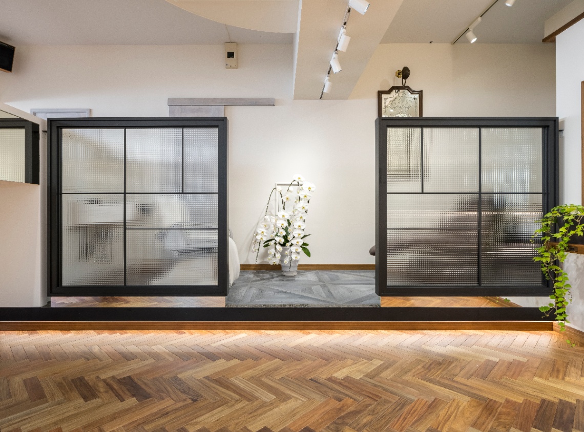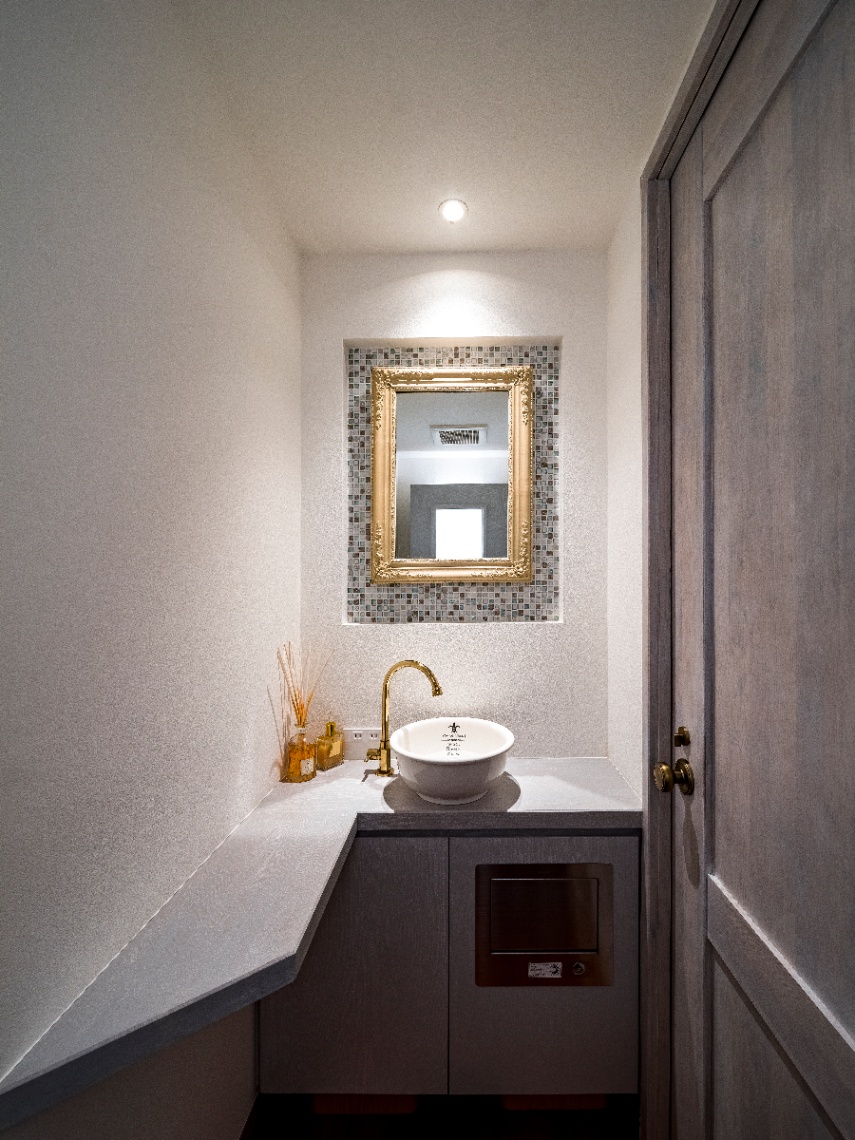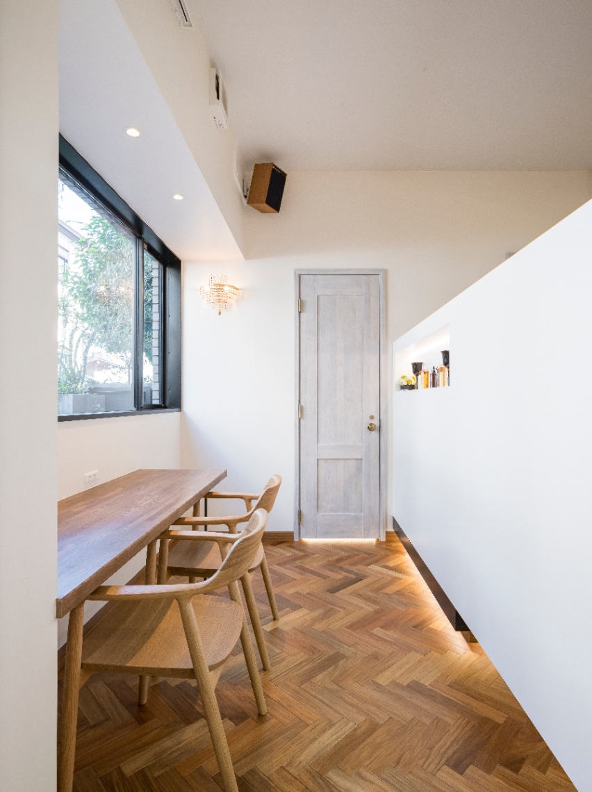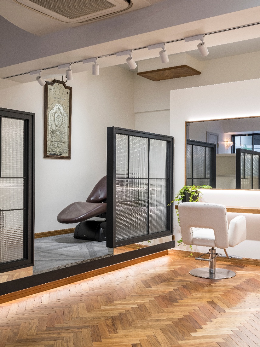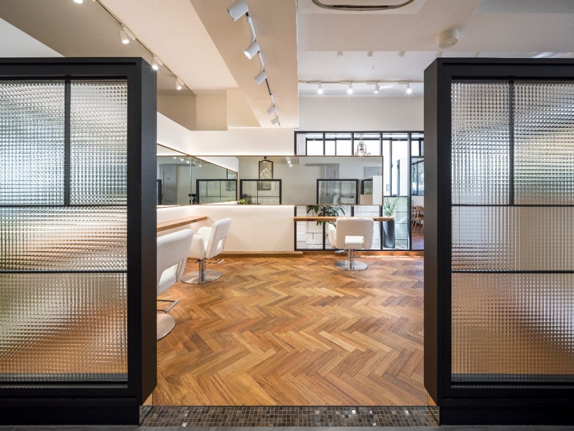 オーナーとの青山での4店舗目の美容室である。20年以上のお付き合いになる。物件探しから加わったこともあり、落ち着いた周辺環境で、設備の弱点のない建物と巡り会えた。鏡が角でつながっていて店舗に広がりを与えている。鏡とテーブルのセットで使いやすいと好評価を頂いた。窓際の凹みは小さな温室風に緑あふれる空間を意図した。初めのFurbish-Oneと比べると、オーナーと設計者共々、落ち着きのある空間を志向しているように思える。
