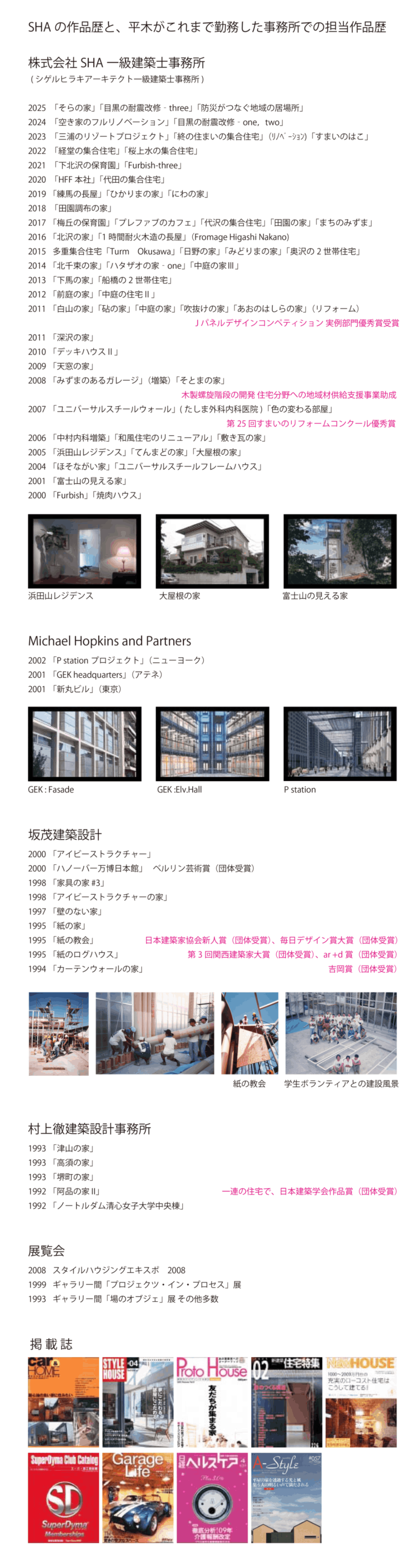 SHAの作品歴と、平木がこれまで勤務した事務所での担当作品歴