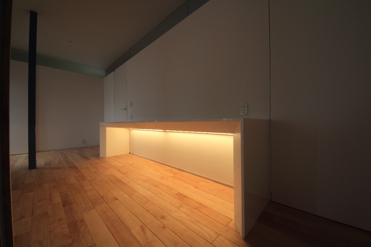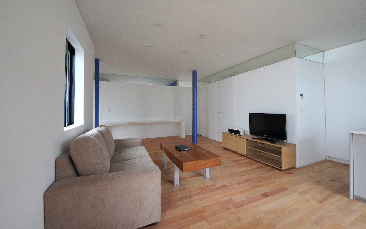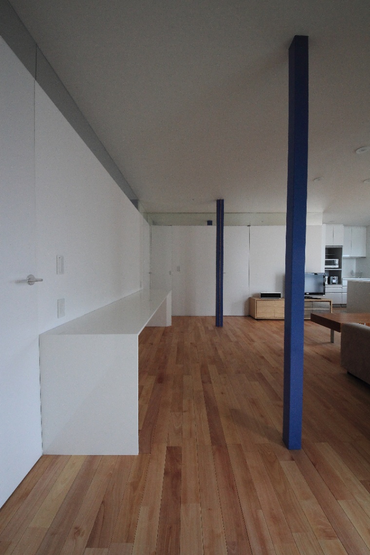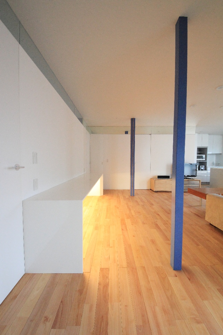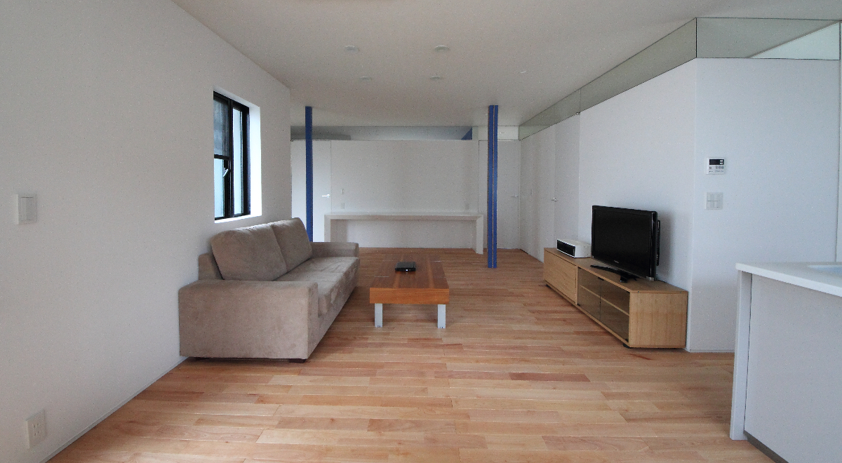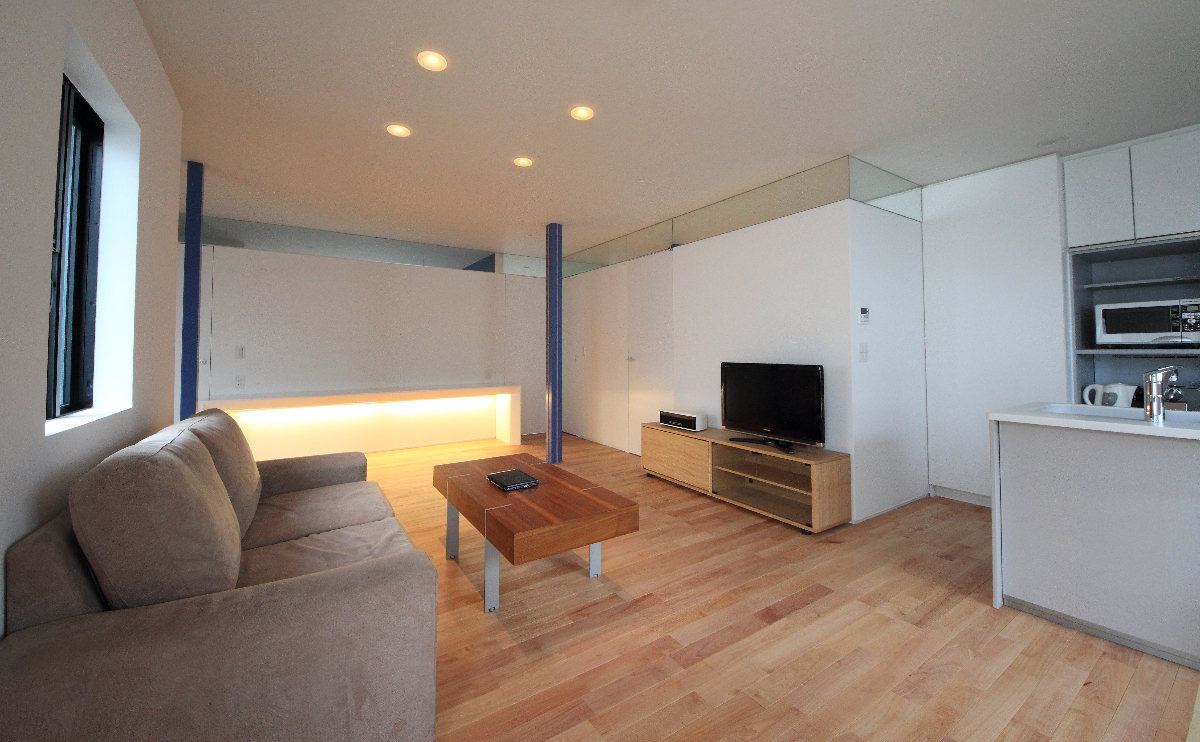 南側個室間仕切り上部のガラスにはランマを設け、新しいリビングとの一体感を確保した。このランマはその一部を鏡とし、トイレ、浴室までリビングを囲むように連続させ、リビングと全室のつながりを確保する重要な建築的要素である。