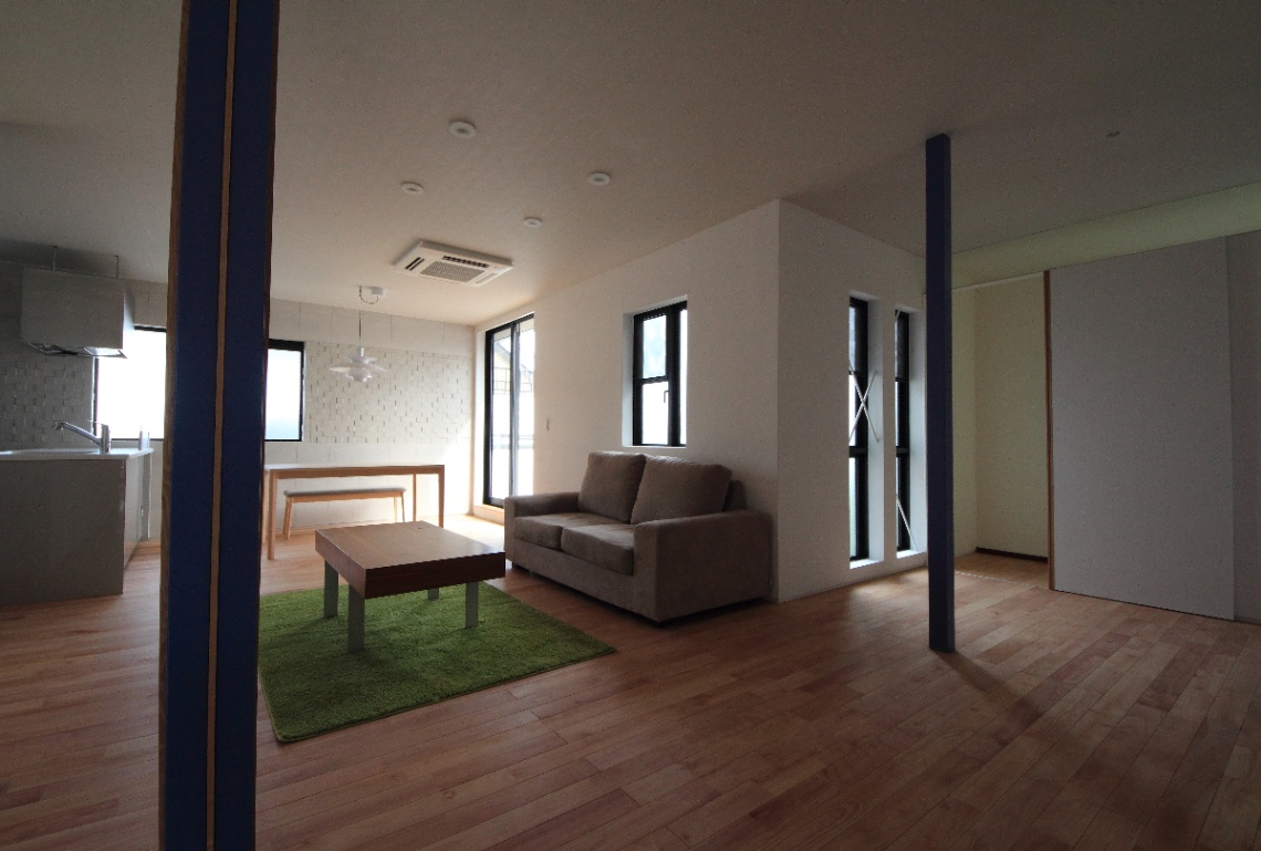 何通りものプラン検討の結果、テラスとリビングのつながりを重視して思い切って北側にリビングを持っていき、南側には子供部屋と主寝室を配置して、納戸を増築した。間柱をなくし、主構造の鉄筋のブレースを移動して対応したが、構造上撤去できない柱は、個室壁と同じ色を塗ってリビングの装飾的要素としている。ハウスメーカーによる住宅の大胆なリノベーションが可能となった。