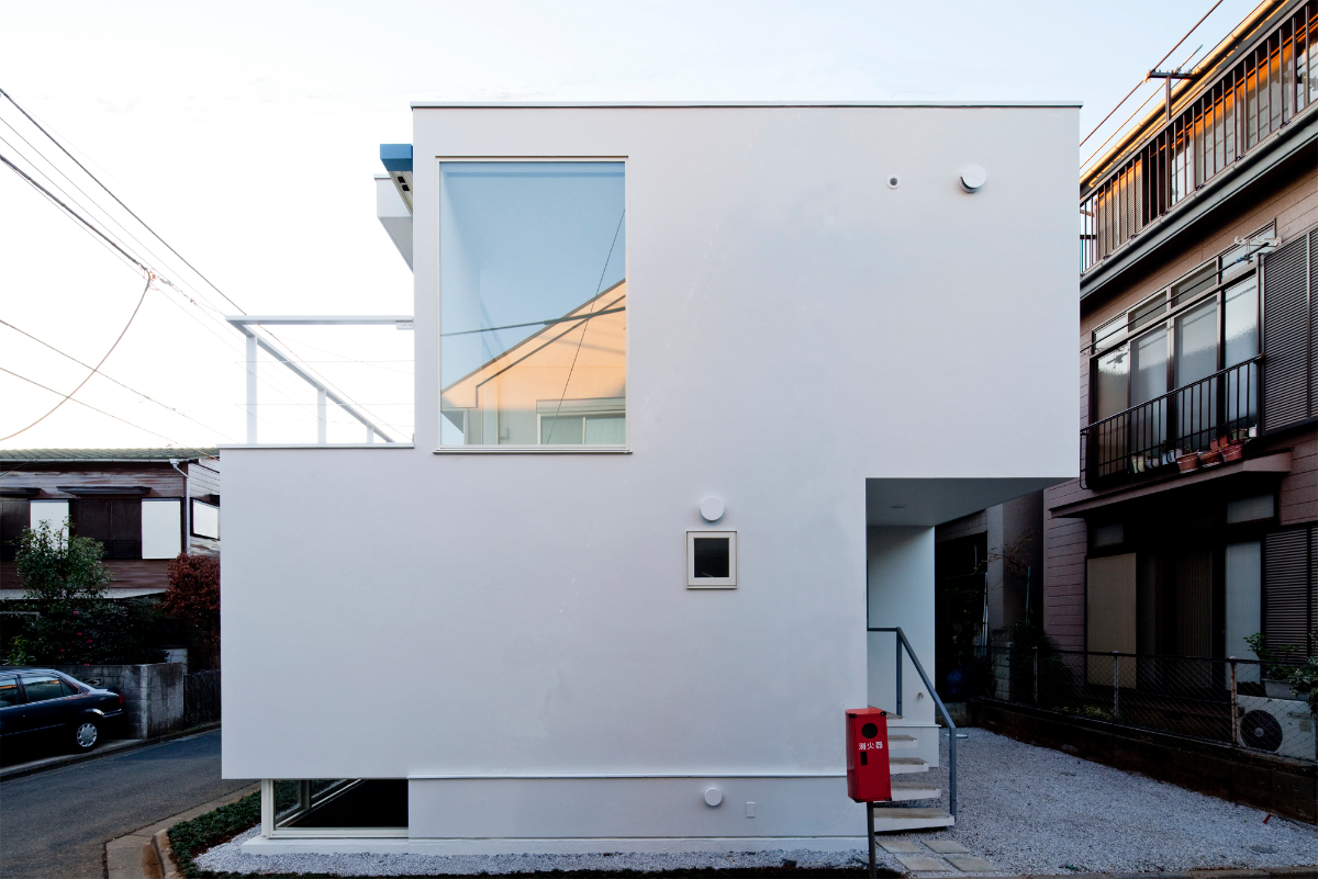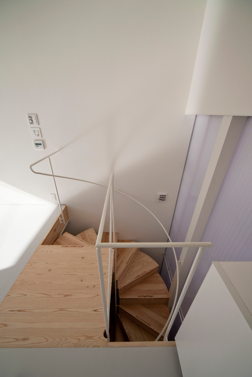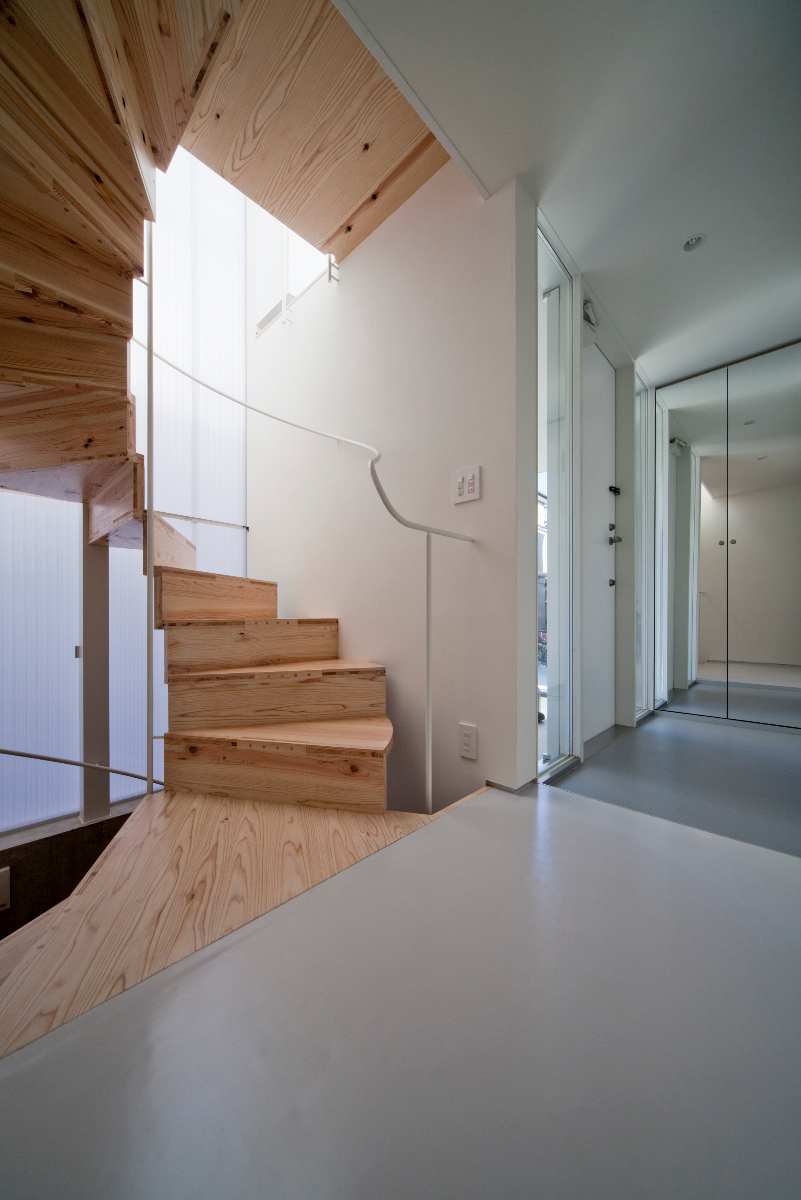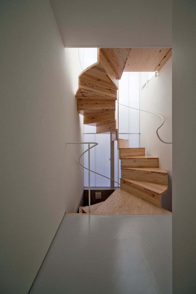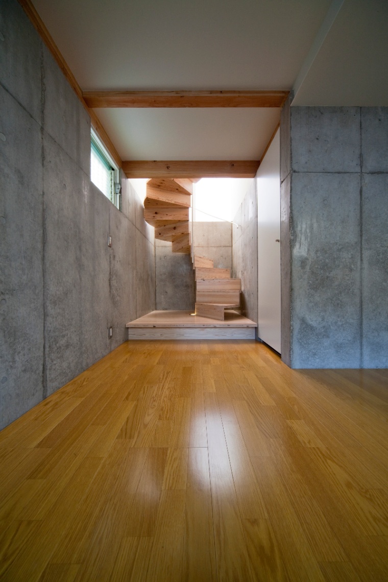 都市型狭小住宅である。40/80という厳しい建築規制の住宅地に最大限の容積を確保するために、寝室を半地下に納め、1階を半階浮かせ、たくさん光の入るリビングを2階に設けた。内部部屋面積を最大限化するために2階から、地下階まで連続する木製螺旋階段を採用した。その螺旋階段の背後の壁を断熱性のある透明壁にし、そこから北側の光を取り入れている。2階ダイニング上部には天窓を設け、光を取り入れるとともに、螺旋階段からの空気を抜く構成とした。コストを徹底的に抑えるために間仕切りや、家具は最小限とした。地階の寝室は、ハイサイドライトが取りまき、地下を感じさせない。現在では、子供の成長に応じて間仕切りが設けられている。
