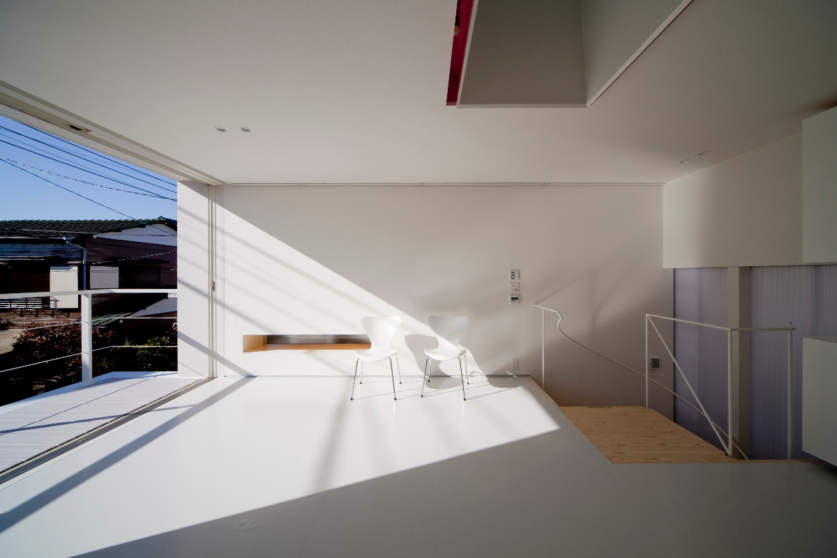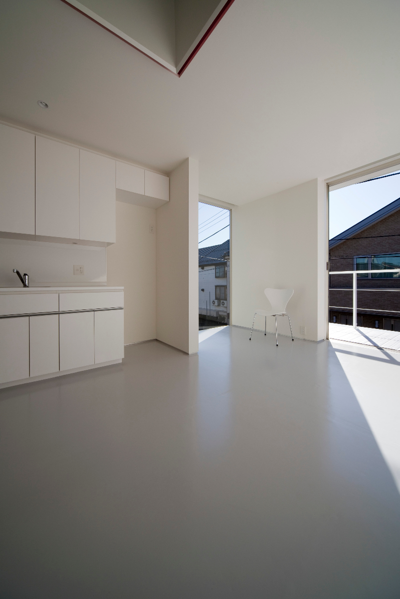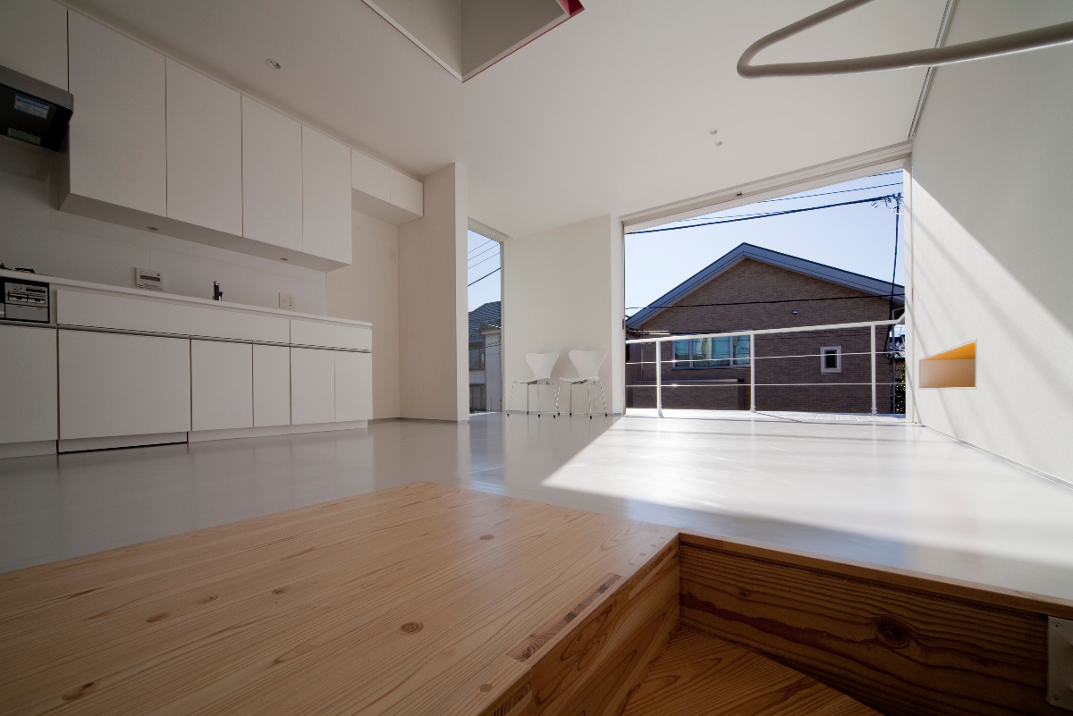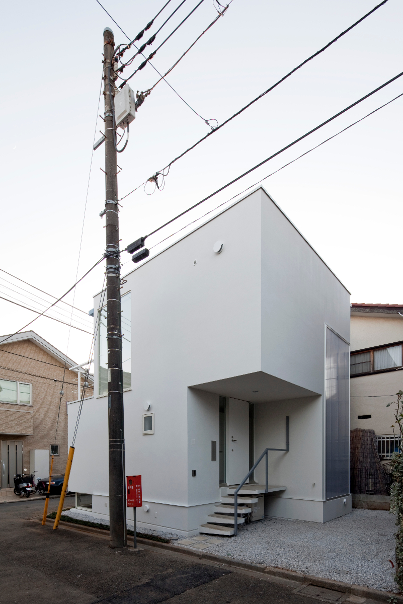 都市型狭小住宅である。40/80という厳しい建築規制の住宅地に最大限の容積を確保するために、寝室を半地下に納め、1階を半階浮かせ、たくさん光の入るリビングを2階に設けた。内部部屋面積を最大限化するために2階から、地下階まで連続する木製螺旋階段を採用した。その螺旋階段の背後の壁を断熱性のある透明壁にし、そこから北側の光を取り入れている。2階ダイニング上部には天窓を設け、光を取り入れるとともに、螺旋階段からの空気を抜く構成とした。コストを徹底的に抑えるために間仕切りや、家具は最小限とした。地階の寝室は、ハイサイドライトが取りまき、地下を感じさせない。現在では、子供の成長に応じて間仕切りが設けられている。