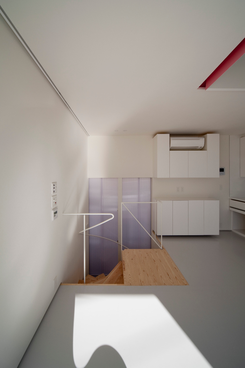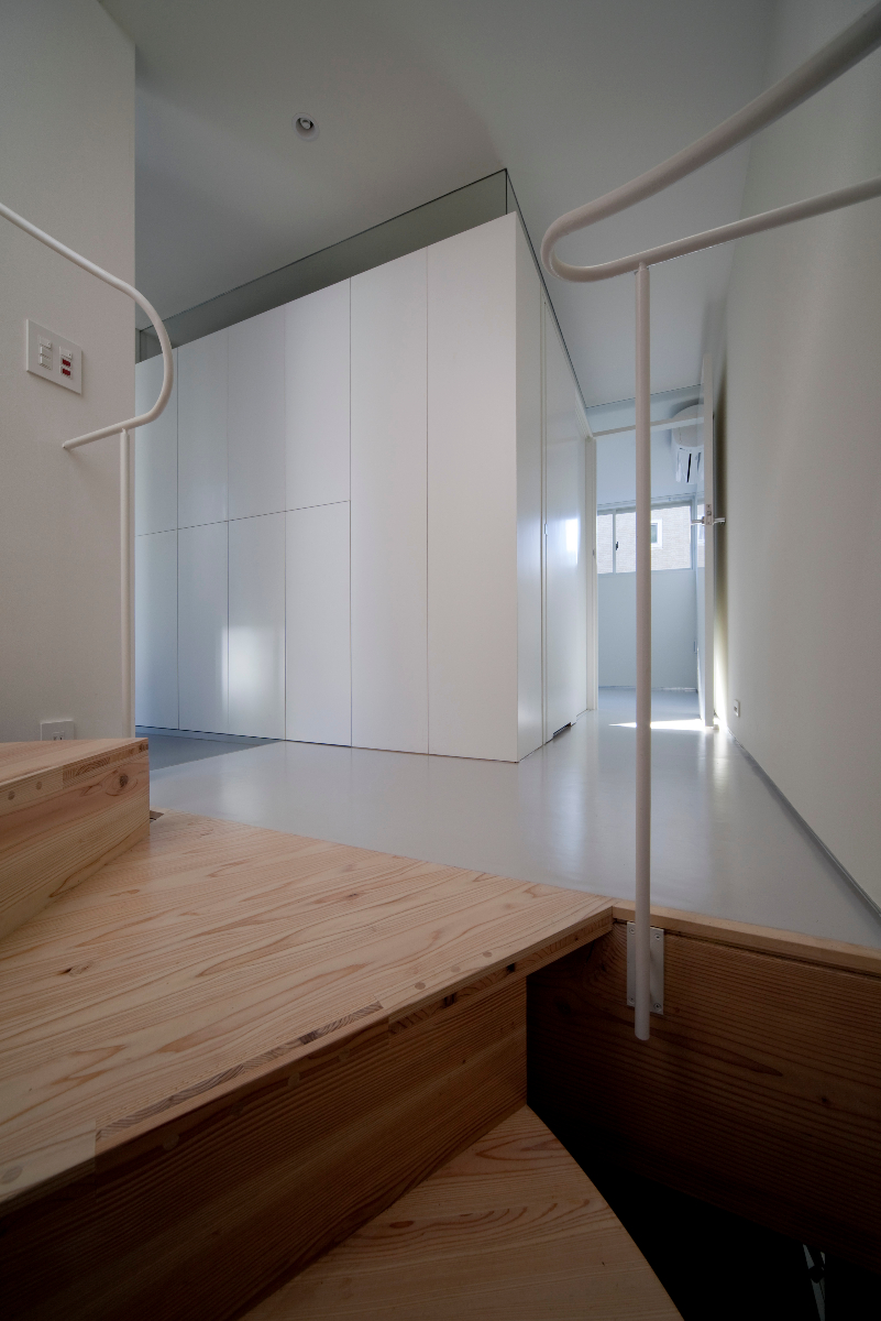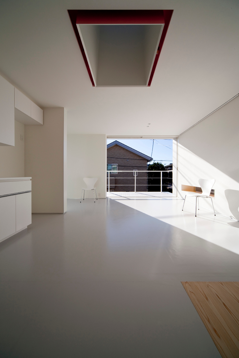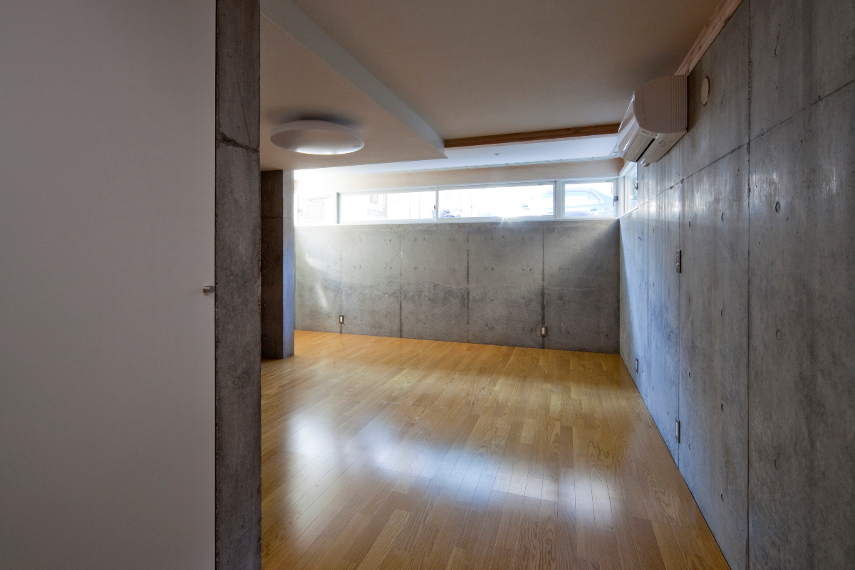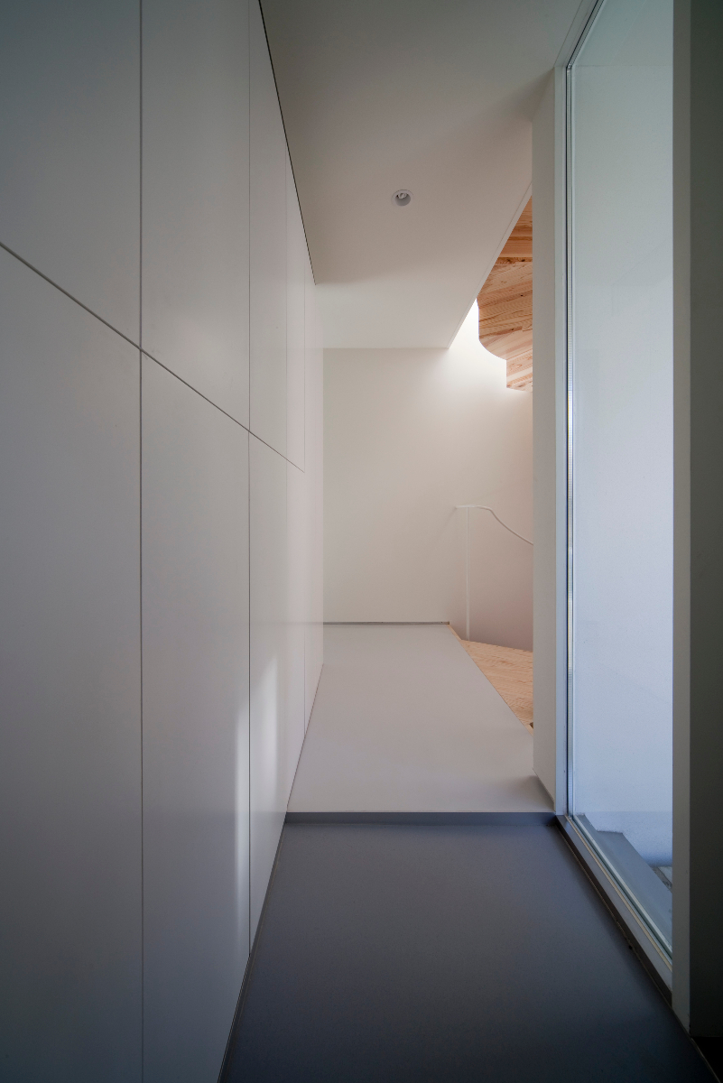 都市型狭小住宅である。40/80という厳しい建築規制の住宅地に最大限の容積を確保するために、寝室を半地下に納め、1階を半階浮かせ、たくさん光の入るリビングを2階に設けた。内部部屋面積を最大限化するために2階から、地下階まで連続する木製螺旋階段を採用した。その螺旋階段の背後の壁を断熱性のある透明壁にし、そこから北側の光を取り入れている。2階ダイニング上部には天窓を設け、光を取り入れるとともに、螺旋階段からの空気を抜く構成とした。コストを徹底的に抑えるために間仕切りや、家具は最小限とした。地階の寝室は、ハイサイドライトが取りまき、地下を感じさせない。現在では、子供の成長に応じて間仕切りが設けられている。