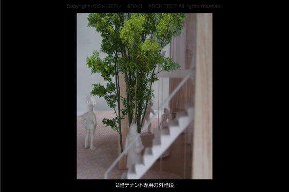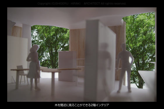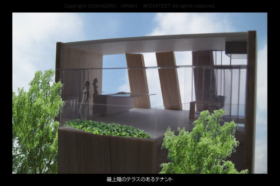 「都会であっても自然が感じられる」ことをコンセプトにした木造の低層商業ビル設計案。自然や環境への意識を重視する企業のためにデザインした。この計画は、木造の自立する4枚の壁の四隅を丸くり抜き、ガラスの筒としてそこに4本のシンボルツリーを植えるものである。このガラスの筒から木漏れる光の時間変化により、屋内空間が変化する。内部では、緑で囲まれたように感じ、緑のフィルターを通して外部を眺めることが出来る。まちに緑とオープンスペースを提供するシンボルツリーは、道行く人を緑で楽しませ、人を誘引する。芝生とデッキとカフェが公園の新しい要素といわれるが、まちのコーナーではなく、建物のコーナーの公園化をイメージした。