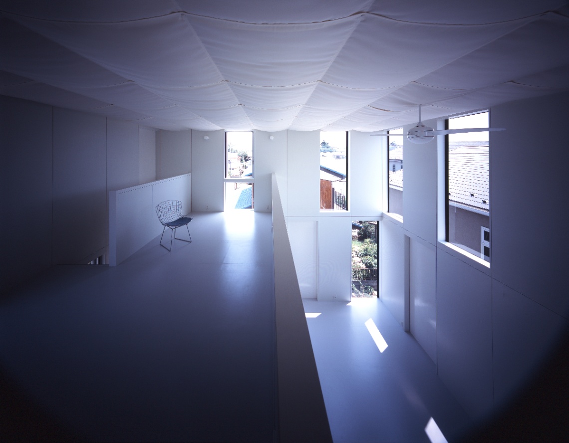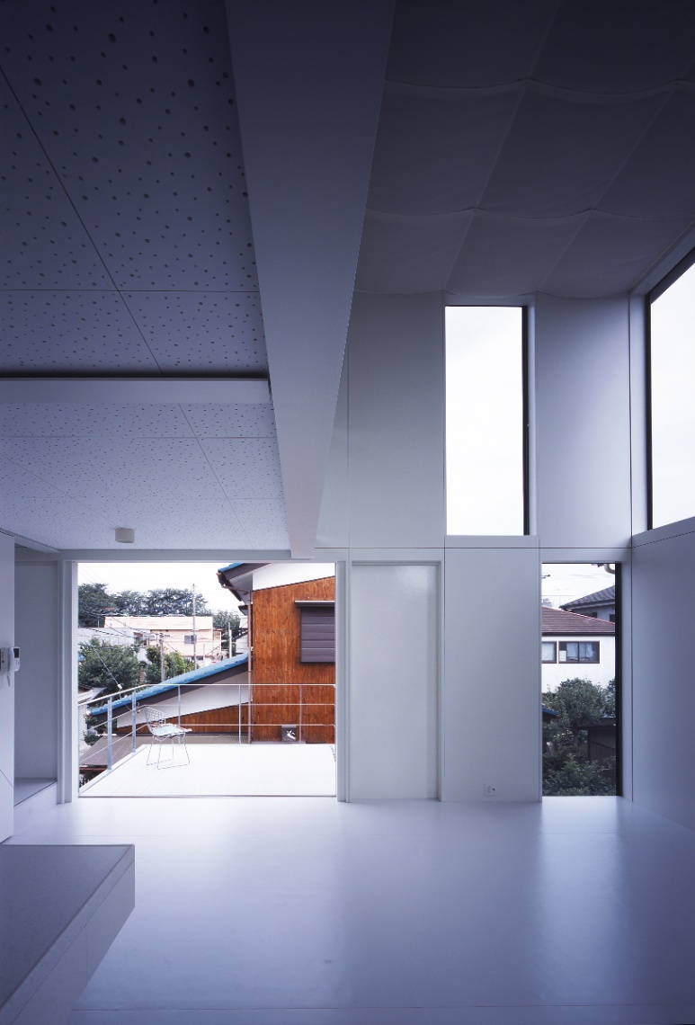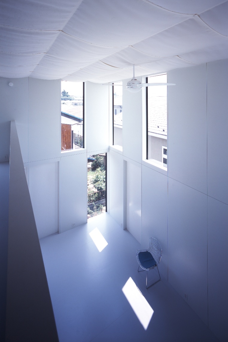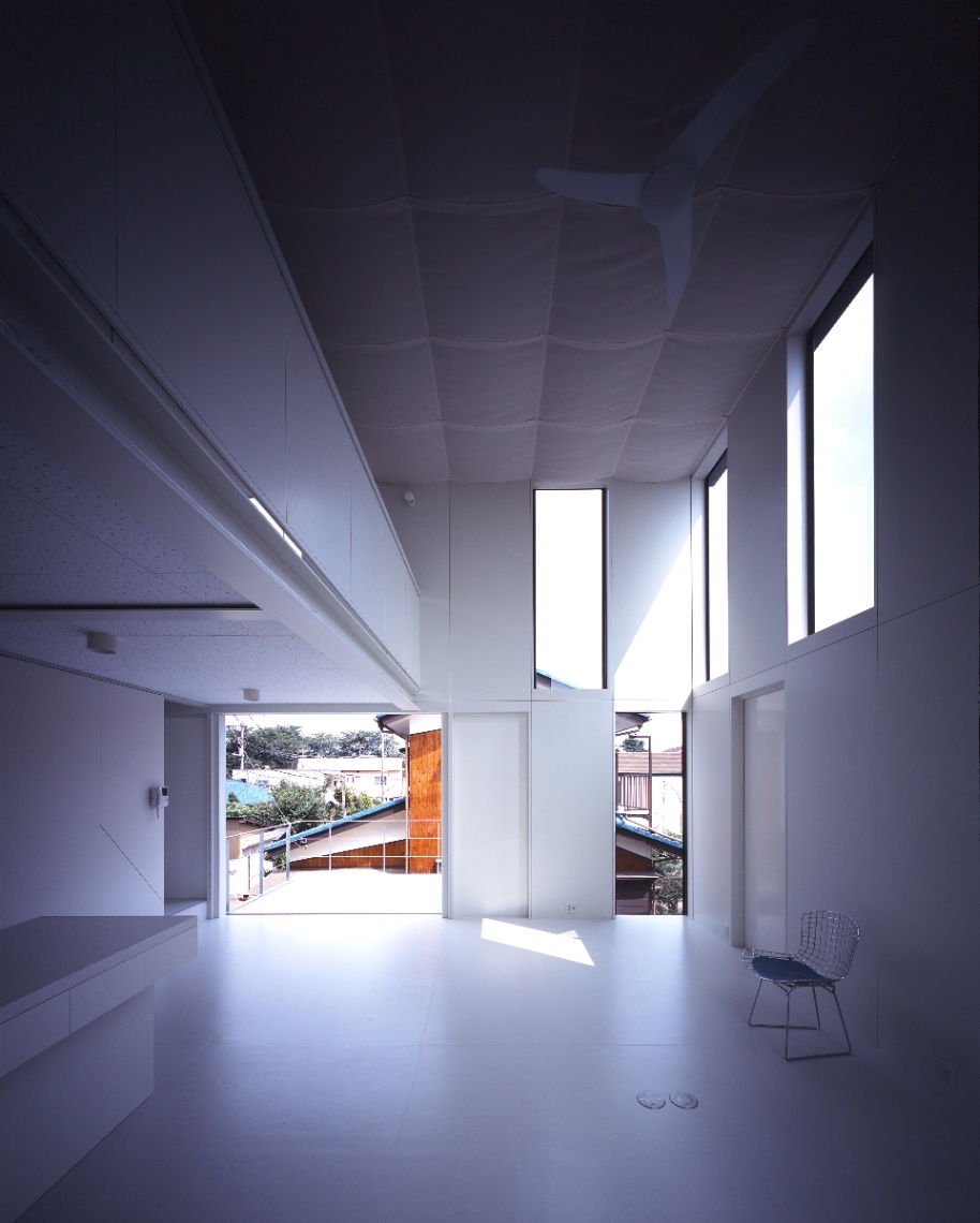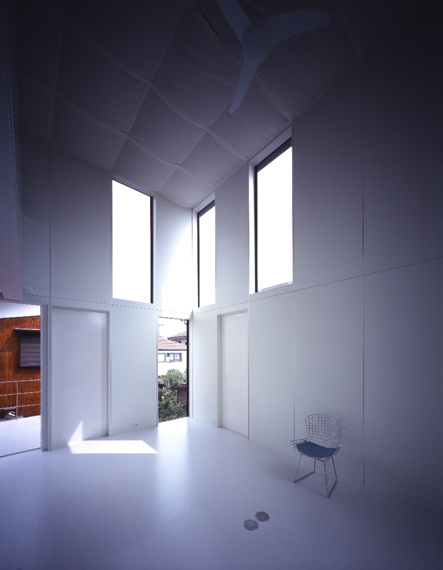 設計当初独身であった若い施主からは、コストを抑え、改築できる余地を残しつつ、ボリュームのある背の高い吹き抜け空間が求めらた。地盤も良くないことから、木造並みに軽量な鉄骨造とし、壁と窓の寸法を標準化・パネル化して徹底した乾式工法とするなどコストパフォーマンスの高いスチールフレームの構造・工法・空間のシステムを考え、施工も分離発注で行った。私は、空間があるシステムで裏付けられ、多様な意味を持っていることが豊かな空間を発生させるために重要であると考えている。時にはそれは予条件として、乗り越えることが困難な呪縛となるかもしれない。呪縛と考えるかシステムと考えるかは、空間を作る側の姿勢の問題でもあるが、システムを空間化すること、その中にも無限の可能性があると信じている。この住宅では、それが構造のユニット化(=工法)と開口(=光)を同時に考えることであった。構造・工法・空間のそれぞれに連携しあったこのシステムは、どこまでも連続して多様な空間をつくることができる。私はこれをユニバーサルスチールフレーム構造と呼んでいる。