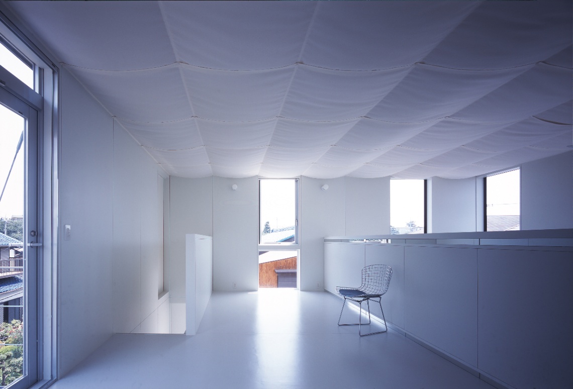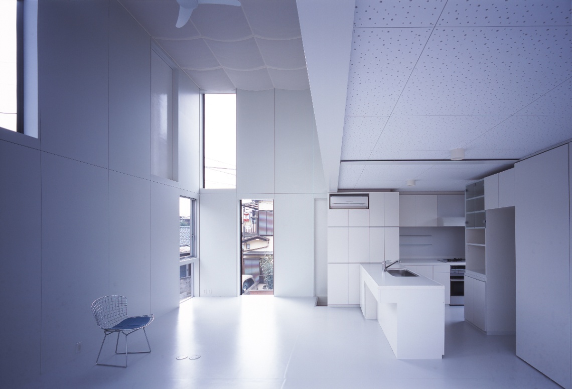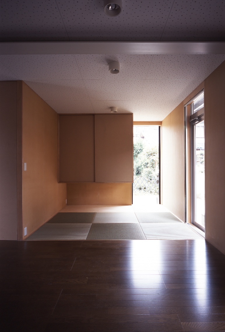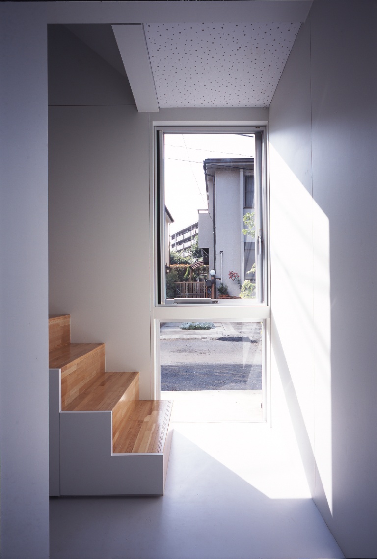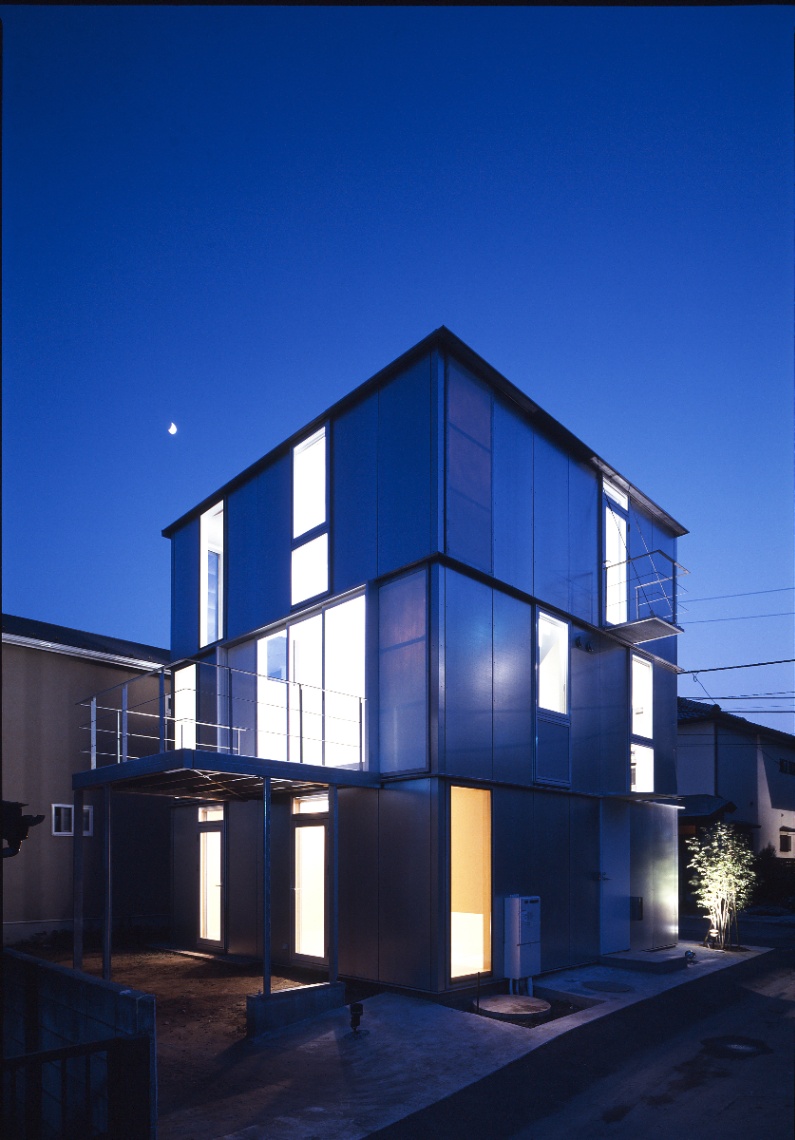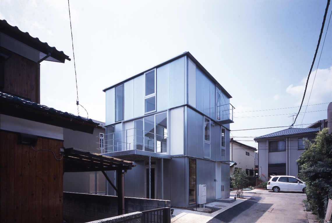 設計当初独身であった若い施主からは、コストを抑え、改築できる余地を残しつつ、ボリュームのある背の高い吹き抜け空間が求めらた。地盤も良くないことから、木造並みに軽量な鉄骨造とし、壁と窓の寸法を標準化・パネル化して徹底した乾式工法とするなどコストパフォーマンスの高いスチールフレームの構造・工法・空間のシステムを考え、施工も分離発注で行った。私は、空間があるシステムで裏付けられ、多様な意味を持っていることが豊かな空間を発生させるために重要であると考えている。時にはそれは予条件として、乗り越えることが困難な呪縛となるかもしれない。呪縛と考えるかシステムと考えるかは、空間を作る側の姿勢の問題でもあるが、システムを空間化すること、その中にも無限の可能性があると信じている。この住宅では、それが構造のユニット化(=工法)と開口(=光)を同時に考えることであった。構造・工法・空間のそれぞれに連携しあったこのシステムは、どこまでも連続して多様な空間をつくることができる。私はこれをユニバーサルスチールフレーム構造と呼んでいる。